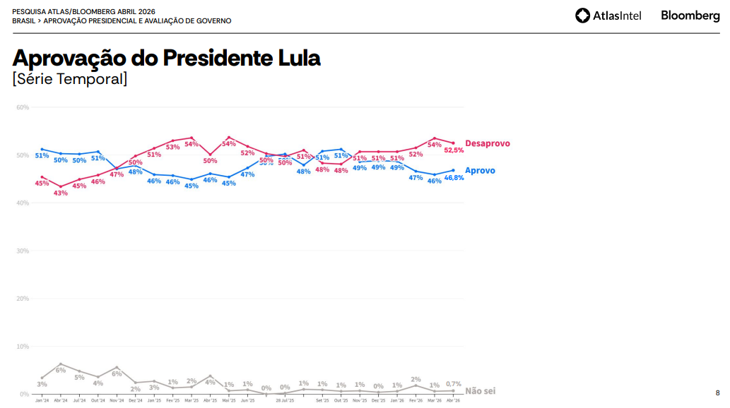 A nova rodada da pesquisa realizada pela AtlasIntel em parceria com a Bloomberg, divulgada nesta terça-feira (28), indica uma melhora consistente nos indicadores do presidente Luiz Inácio Lula da Silva — tanto na avaliação de governo quanto nas projeções eleitorais para 2026.