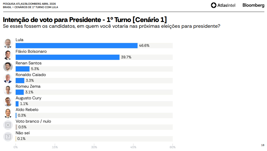 Nos cenários de primeiro turno testados com Lula como candidato, ele segue liderando, enquanto adversários aparecem fragmentados. Já nas simulações de segundo turno, o presidente mantém vantagem, incluindo em um possível embate contra Flávio Bolsonaro, nome testado como herdeiro político do bolsonarismo.