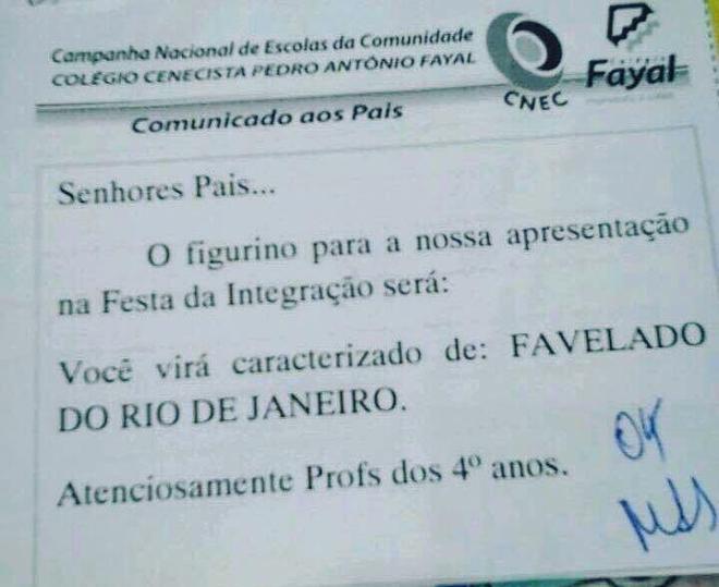 A solicitação era para uma parte dos alunos do 4º ano do colégio particular Fayal, de Itajaí (SC). O figurino de um favelado, segunda a direção da escola, é bermuda, chinelo, óculos escuros e boné.