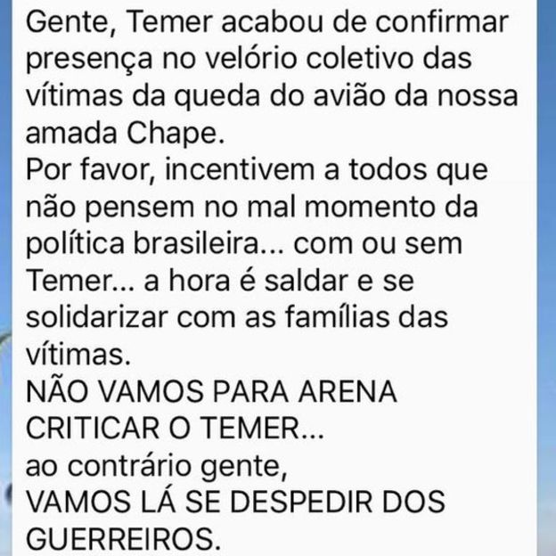 Uma mensagem de WhatsApp circulou entre os moradores da cidade com o seguinte teor: “Não pensem no mau momento da política brasileira (…) Não vamos para a Arena criticar o Temer… ao contrário, gente, vamos lá nos despedir dos guerreiros”.