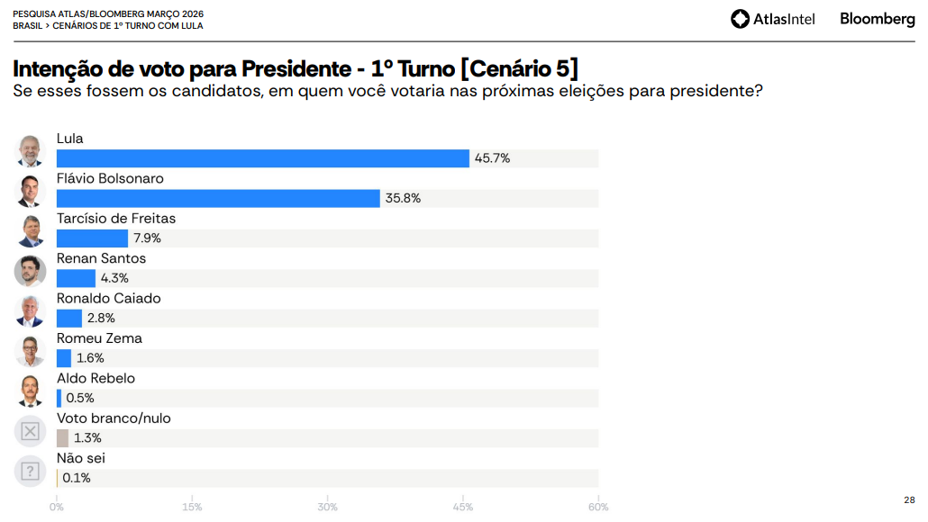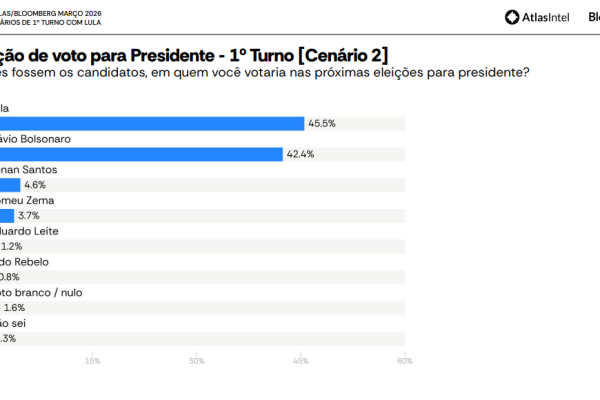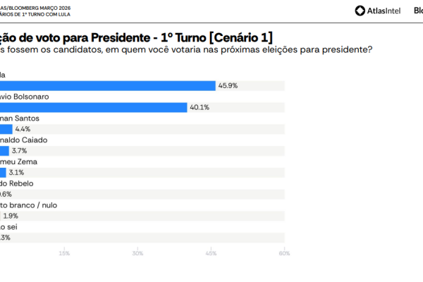 No cenário principal, o Lula aparece com 45,9% das intenções de voto, contra 40,1% de Flávio Bolsonaro. Na sequência, surgem Renan Santos, com 4,4%, Ronaldo Caiado, com 3,7%, Romeu Zema, com 3,1%, e Aldo Rebelo, com 0,6%. Os votos em branco ou nulos somam 1,9%, enquanto 0,3% dos entrevistados disseram não saber.