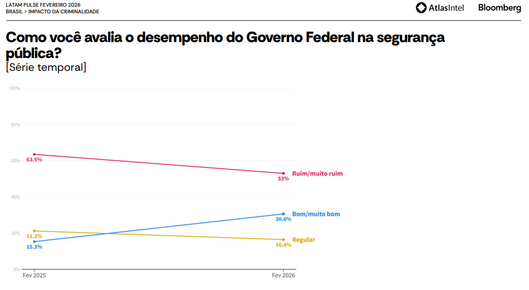 A maioria dos brasileiros avalia negativamente a atuação do governo Luiz Inácio Lula da Silva (PT) na área de segurança pública, segundo pesquisa AtlasIntel/Bloomberg divulgada nesta quinta-feira (26), mas há uma melhora de percepção no último ano.