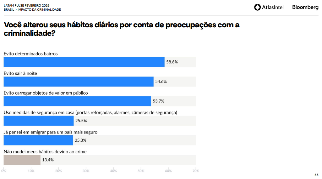 O impacto da criminalidade na rotina dos brasileiros também foi medido. Entre os entrevistados, 58,6% disseram evitar determinados bairros, 54,6% evitam sair à noite e 53,7% deixaram de carregar objetos de valor em público. Além disso, 25,5% reforçaram a segurança doméstica com câmeras, alarmes ou portas reforçadas, enquanto 25,3% afirmaram já ter considerado deixar o Brasil em busca de mais segurança. Apenas 13,4% disseram não ter alterado seus hábitos por causa da violência.