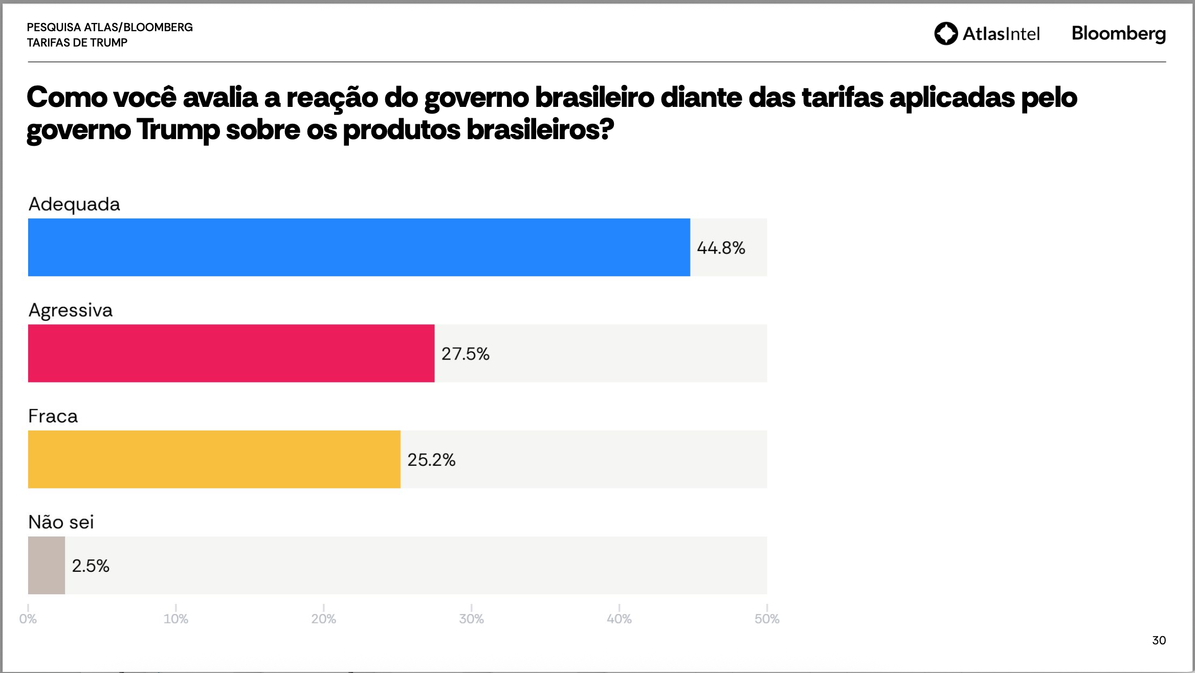 Pesquisa AtlasIntel divulgada nesta terça (15) revela que a maioria da população brasileira considera injustificada a decisão do presidente dos Estados Unidos, Donald Trump, de impor tarifas de 50% sobre produtos brasileiros.
