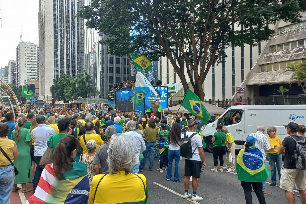 Enquanto milhares pediam justiça e políticas de proteção às mulheres, a poucos metros acontecia o ato pró-Bolsonaro, que defendia anistia ao ex-presidente e criticava o PL da Anistia e a PEC da Blindagem. Os manifestantes vestiam verde e amarelo e entoavam palavras de ordem pela liberdade de Jair Bolsonaro.