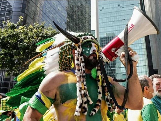 Um bolsonarista com fantasia inspirada no ‘viking’ do Capitólio participou do ato golpista promovido pelo presidente Jair Bolsonaro na Avenida Paulista, em São Paulo.