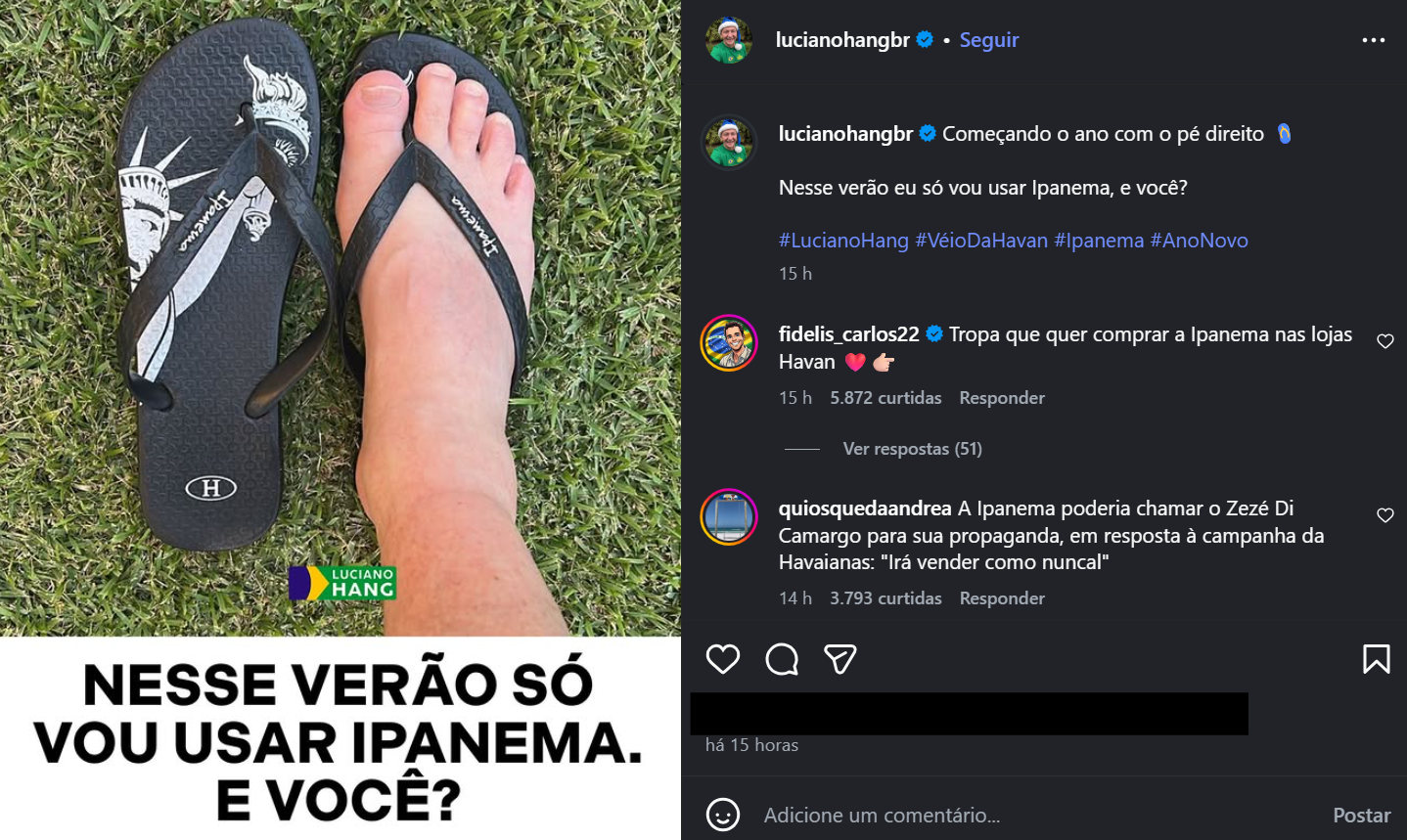 Em publicação feita no Instagram no domingo (21), Hang afirmou que vai “começar o ano com o pé direito” e declarou que passará a “usar somente Ipanema”, em referência a uma marca concorrente das Havaianas.