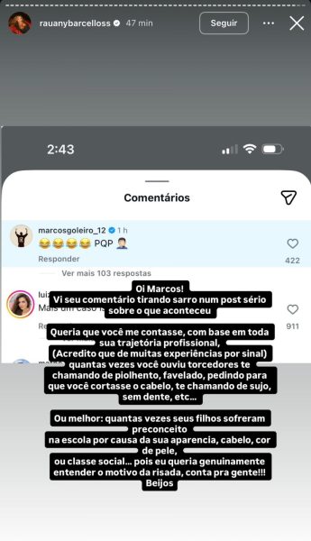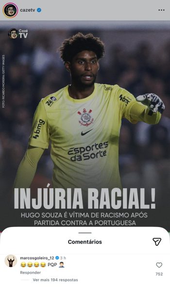 A esposa de Hugo Souza, Rauany Barcellos, publicou o print do comentário e confrontou o bolsonarista no Instagram: “Vi seu comentário tirando sarro num post sério sobre o que aconteceu. Queria que você me contasse, com base em toda sua trajetória profissional (acredito que de muitas experiências por sinal) quantas vezes você ouviu torcedores te chamando de piolhento, favelado, pedindo para que você cortasse o cabelo, te chamando de sujo, sem dente, etc”.