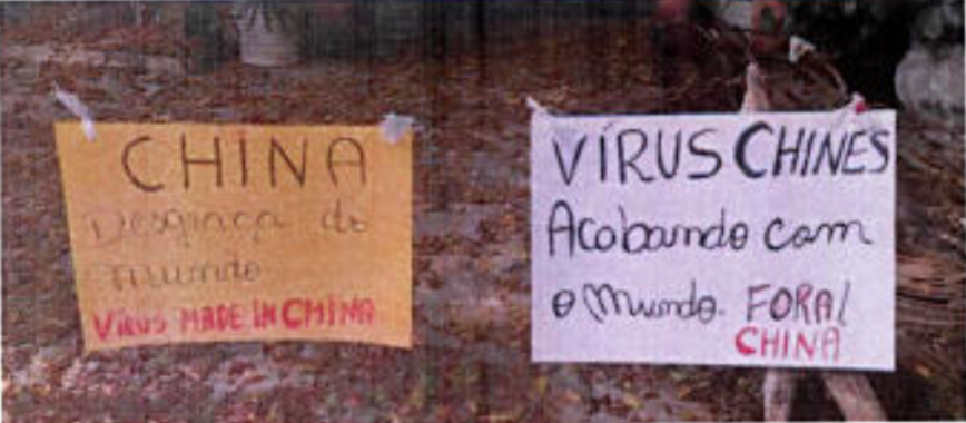 Exibiam faixas e cartazes com palavras de ordem como “Chinese Wuhan Pneumonia”, “China fora do Brasil seu vírus acabando com os empregos”, “China desgraça do mundo”, “Vírus made in China” etc.