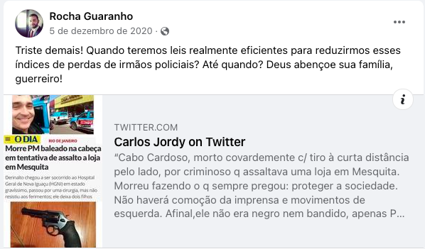 O Facebook de Guaranho mostra sua radicalização. De fotos com a camisa do Vasco, ele evoluiu para propaganda de Bolsonaro, fotos de “arminha” com as mãos e xingamentos ao STF, a Lula e ao “comunismo”.