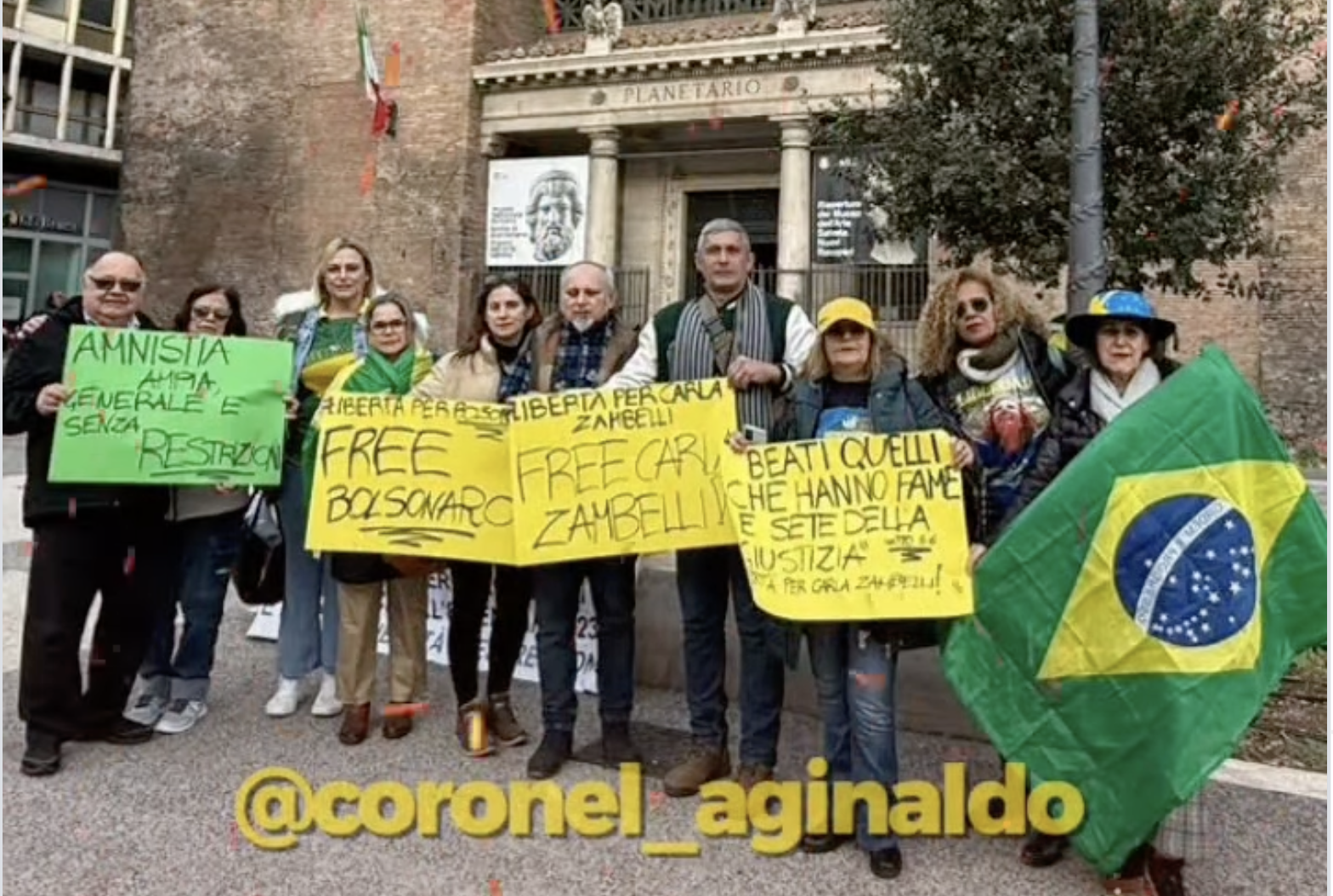 Aginaldo compartilhou nas redes sociais imagens de um protesto em Roma, em que meia-dúzia de gatos pingados pediam a liberdade da deputada e do ex-presidente Jair Bolsonaro.