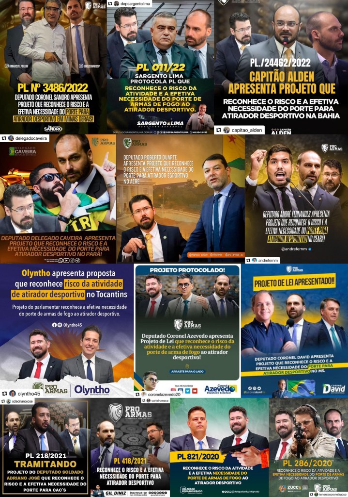 No entanto, à exceção de Delmasso e de Alexandre Freitas (Podemos-RJ), todos os deputados que fizeram projetos de lei para liberar o porte de arma para CACs em seus estados postaram no Instagram montagens em que aparecem ao lado de Pollon e de Eduardo Bolsonaro comemorando a tramitação dos PLs. Todas as 13 postagens foram feitas ao longo dos últimos cinco dias e 10 exibem marca d’água no Movimento Pró-Armas.