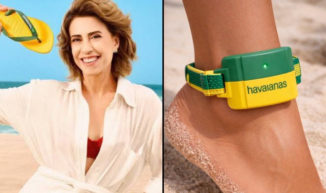 A atriz Fernanda Torres em comercial das Havaianas e montagem de tornozeleira eletrônica com o símbolo da marca. Foto: Reprodução