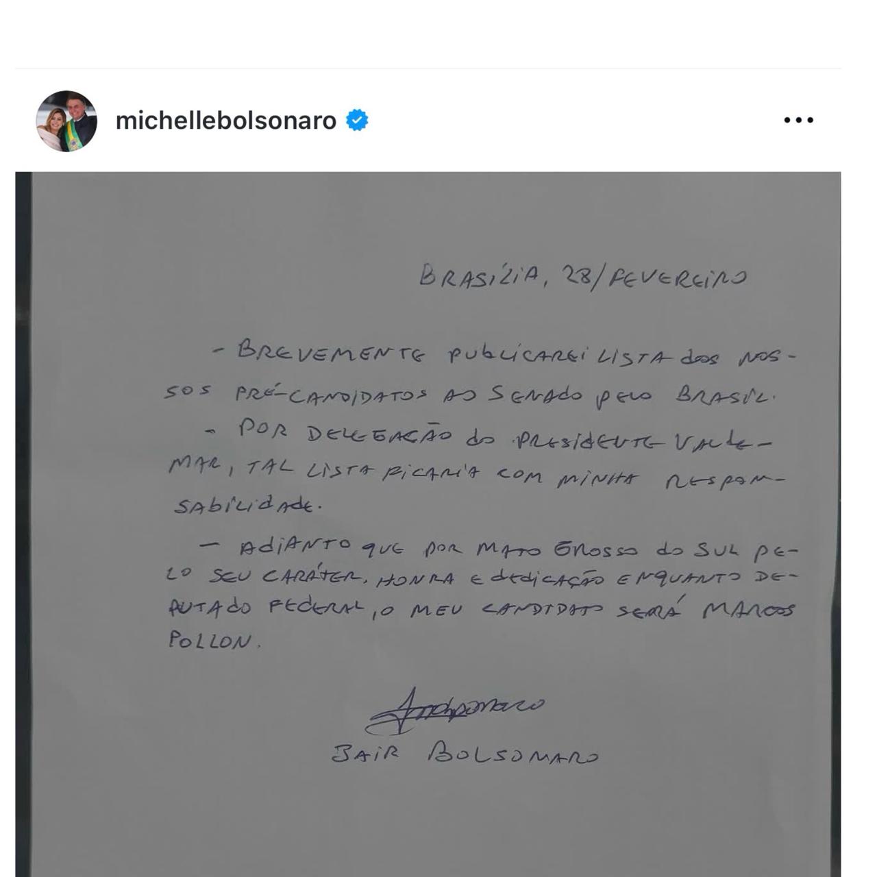 Bolsonaro antecipa apoio a Marcos Pollon para o Senado em carta divulgada por Michelle