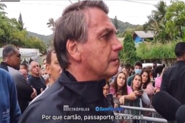 “Por que passaporte da vacina? Eu queria ver o jogo do Santos agora e me falaram que tem que estar vacinado. Por que isso? Eu tenho mais anticorpos do que quem tomou a vacina”, disse o presidente.