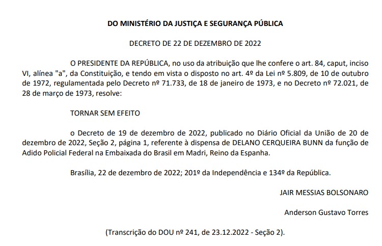 Em 19 de dezembro, o Diário Oficial da União estampou a exoneração do delegado de Polícia Federal Delano Cerqueira Bunn do cargo de adido policial da Embaixada do Brasil em Madri, na Espanha. O decreto de exoneração foi assinado pelo presidente Jair Bolsonaro e pelo ministro Anderson Torres, da Justiça.