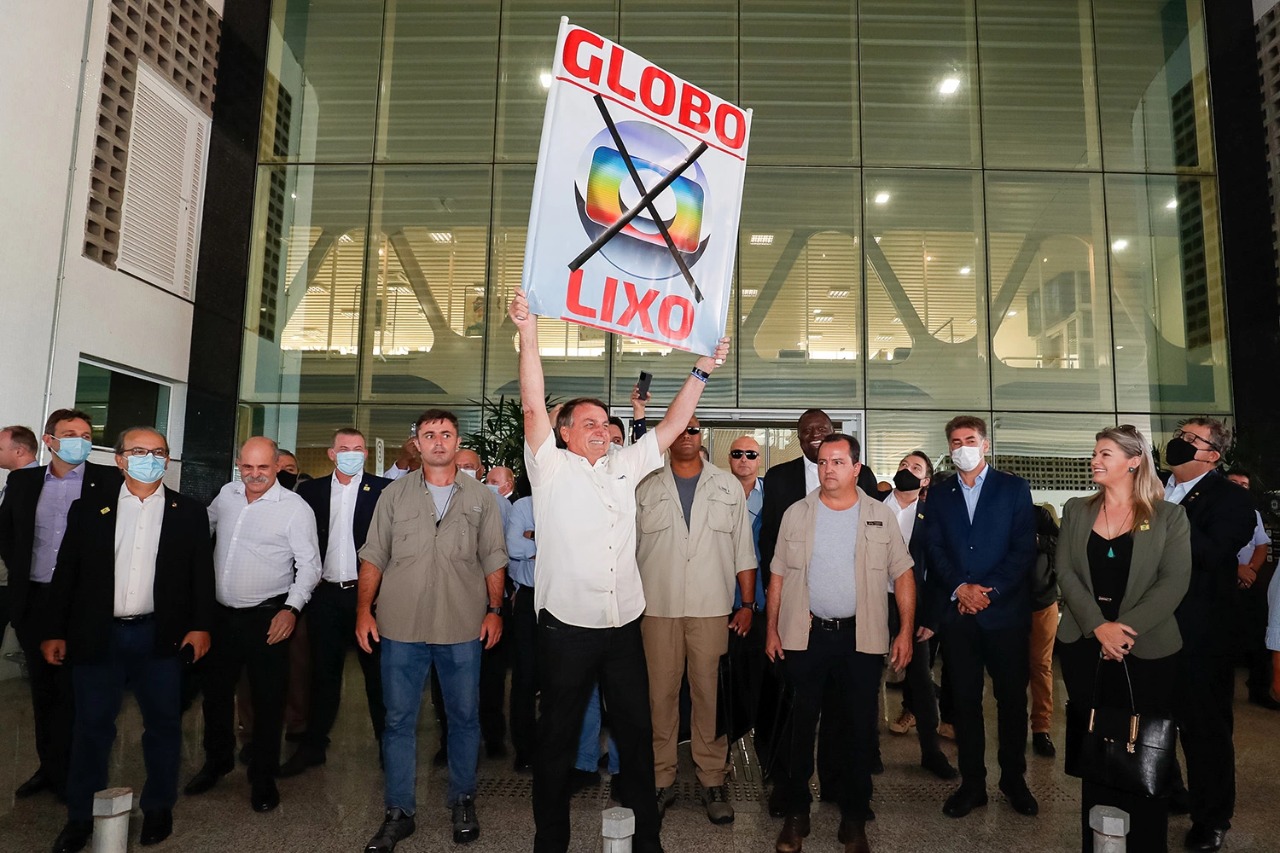 Bolsonaro ergue cartaz escrito “Globo lixo”