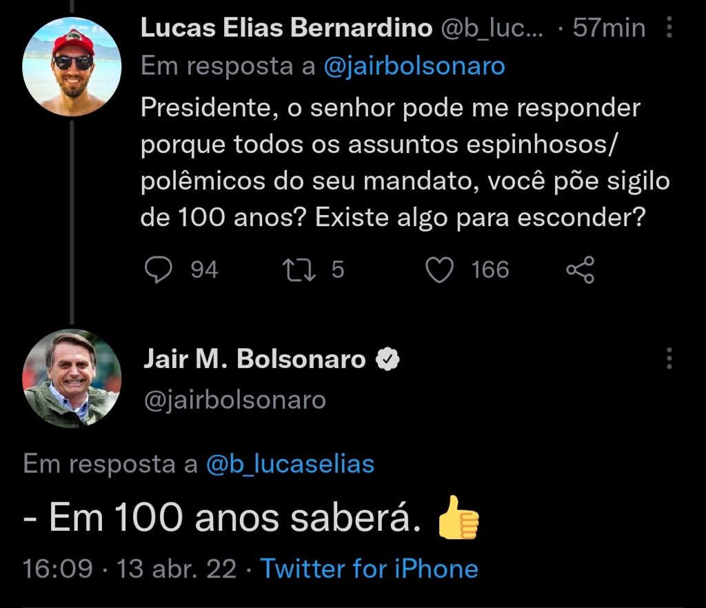 “Presidente, o senhor pode me responder por que todos os assuntos espinhosos/polêmicos do seu mandato, você põe sigilo de 100 anos? Existe algo para esconder?”, indagou. “Em 100 anos saberá”, rebateu o governante do poder executivo federal.