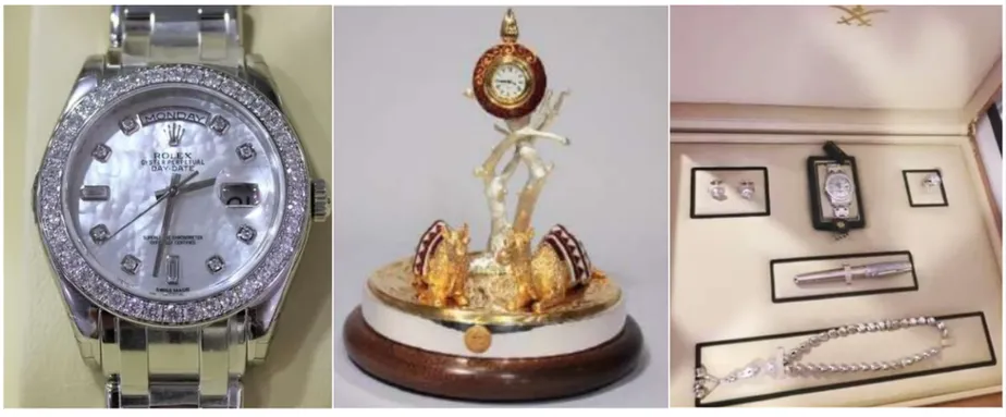 O segundo, foi recebido junto com as joias enviadas a ex-primeira-dama. O conjunto masculino incluía um relógio, uma caneta, um par de abotoaduras, um anel e um rosário árabe.