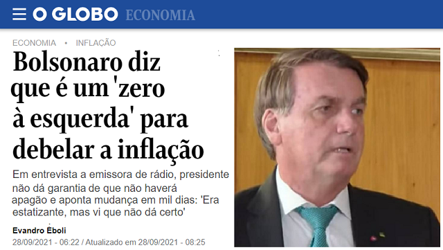 Depois de afirmar que “nada é tão ruim que não possa piorar”, disse a O Globo que ele é “um zero à esquerda” em matéria de economia e que está a cargo do presidente do Banco Central, Roberto Campos Neto, evitar que a inflação dispare, ainda que não possa fazer isso à custa de aumentos seguidos das taxas de juros.