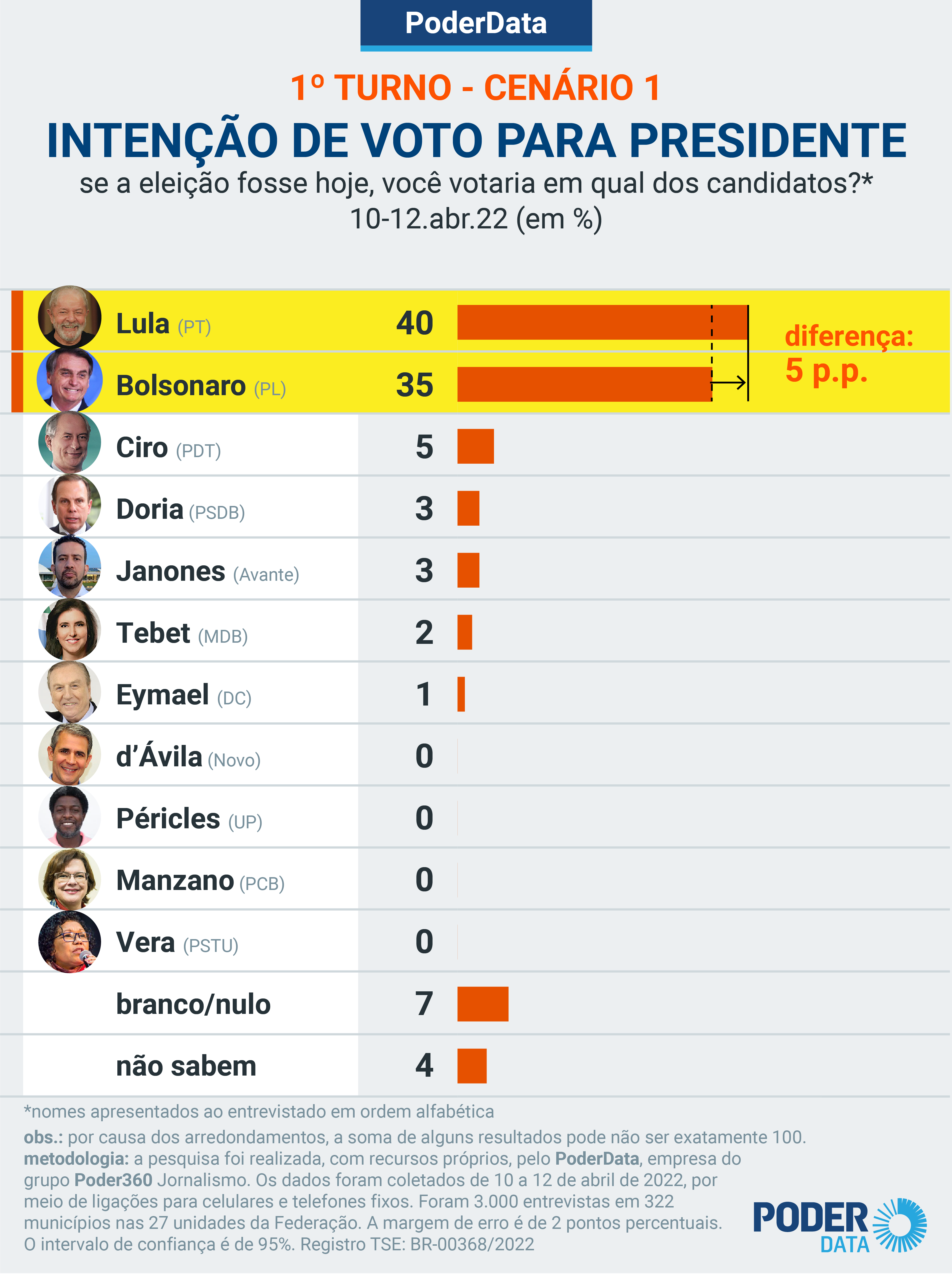 Realizada pelo PoderData, empresa do grupo Poder360 Jornalismo, a pesquisa foi realizada entre 10 e 12 de abril de 2022, por meio de ligações telefônicas. Foram 3.000 entrevistas em 322 municípios nas 27 unidades da Federação.