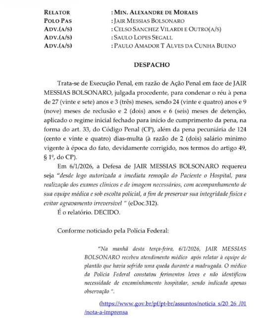 O documento foi solicitado por Moraes depois de pedido da defesa para que Bolsonaro fosse autorizado a realizar exames em um hospital particular. Com base nas primeiras informações, o ministro afirmou que não havia necessidade de remoção imediata, mas determinou o envio do laudo completo e a especificação dos procedimentos médicos pretendidos pelos advogados.
