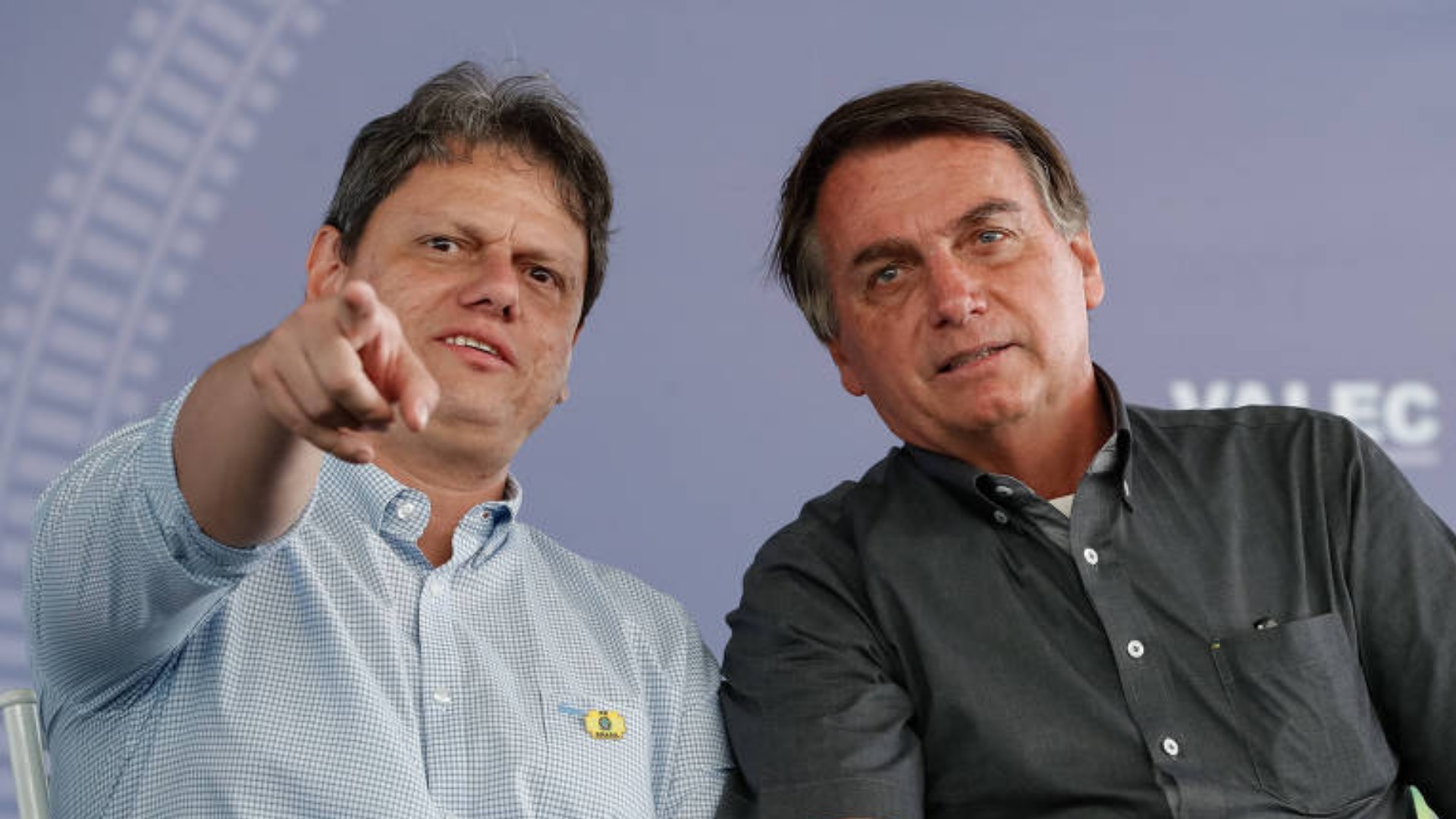 Tarcísio Freitas ao lado de Jair Bolsonaro. Tarcísio aponta para algum lugar e Bolsonaro se inclina para ver.