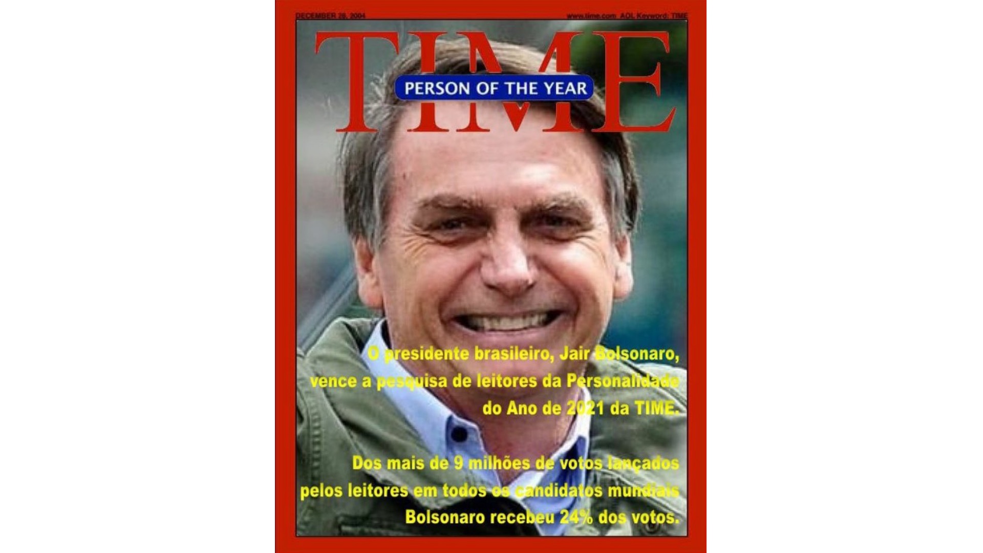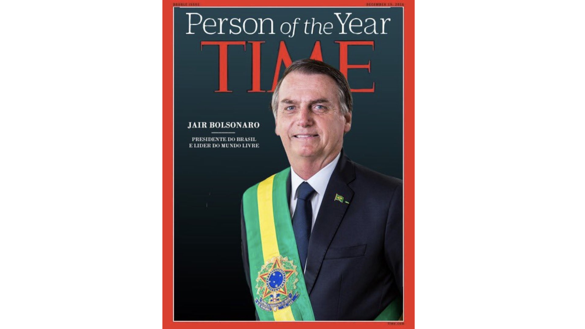 Em novembro de 2018, pouco depois de ele vencer a eleição, circulou nas redes sociais uma imagem fake mostrando Bolsonaro como “Personalidade do Ano” segundo a revista. A montagem tosca logo foi desmentida por agências de verificação.