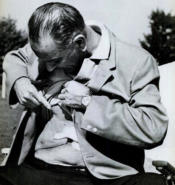 Certo dia, para espanto dos jornalistas que cobriam a Casa Branca, Johnson levantou sua camisa para exibir a cicatriz de uma recente cirurgia de vesícula. Celebrizada, a foto serviu de deixa para que o famoso cartunista Davi Levine, da revista New York Review of Books, criasse uma imagem, com um mapa do Vietnã, sobre o local da operação.