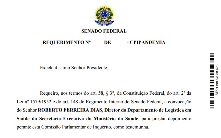 Ademais, Roberto Ferreira Dias foi convocado à CPI da Covid na condição de testemunha. Leia abaixo trecho do requerimento apresentado em 25 de junho: