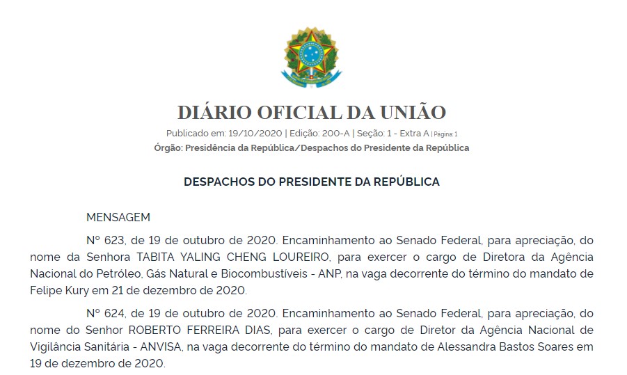 O presidente Jair Bolsonaro (sem partido) tentou nomear Roberto Ferreira Dias, envolvido em suposto esquema de propina, para o cargo de Diretor da Agência Nacional de Vigilância Sanitária (Anvisa), de acordo com Diário Oficial da União publicado em 19 de outubro de 2020