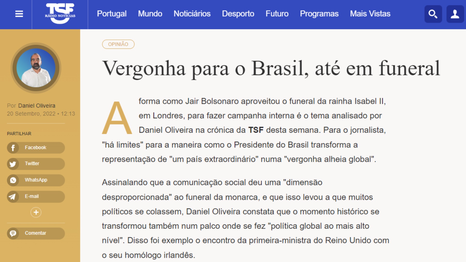 “Vergonha para o Brasil, até em funeral”, diz a crônica semanal de Daniel Oliveira. “Há aquele membro de todas as famílias que ninguém convida para os jantares a não ser no Natal porque tem de ser”, ironiza.