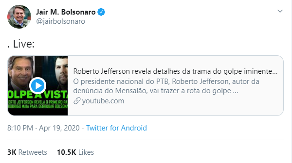 Jair Bolsonaro está há horas retransmitindo ao vivo uma live do condenado Roberto Jefferson explicando como Rodrigo Maia vai dar um golpe de estado.