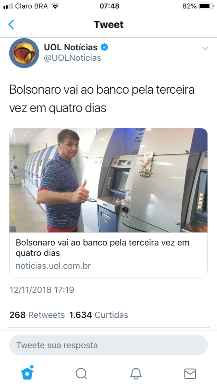 O UOL registra que o “presidente eleito foi a uma agência bancária pela terceira vez nos últimos quatro dias”.