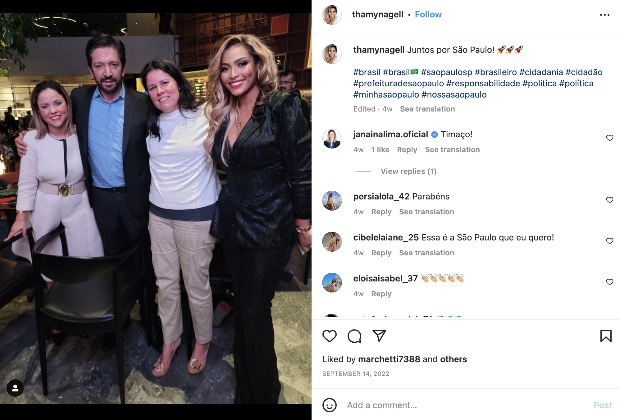 A frase acima foi escrita pela influencer Thamyres Nagell em sua página no Instagram na segunda, 6 de março. Na quarta, 8, recebeu o carimbaço, publicado no Diário Oficial: sua nomeação como sub-prefeita de Santo Amaro.