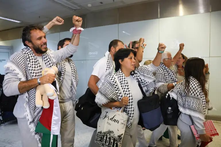 Cerca de 100 pessoas receberam os “flotilhados brasileiros” no aeroporto, com bandeiras da Palestina, faixas criticando Israel e gritos de “Palestina Livre”.