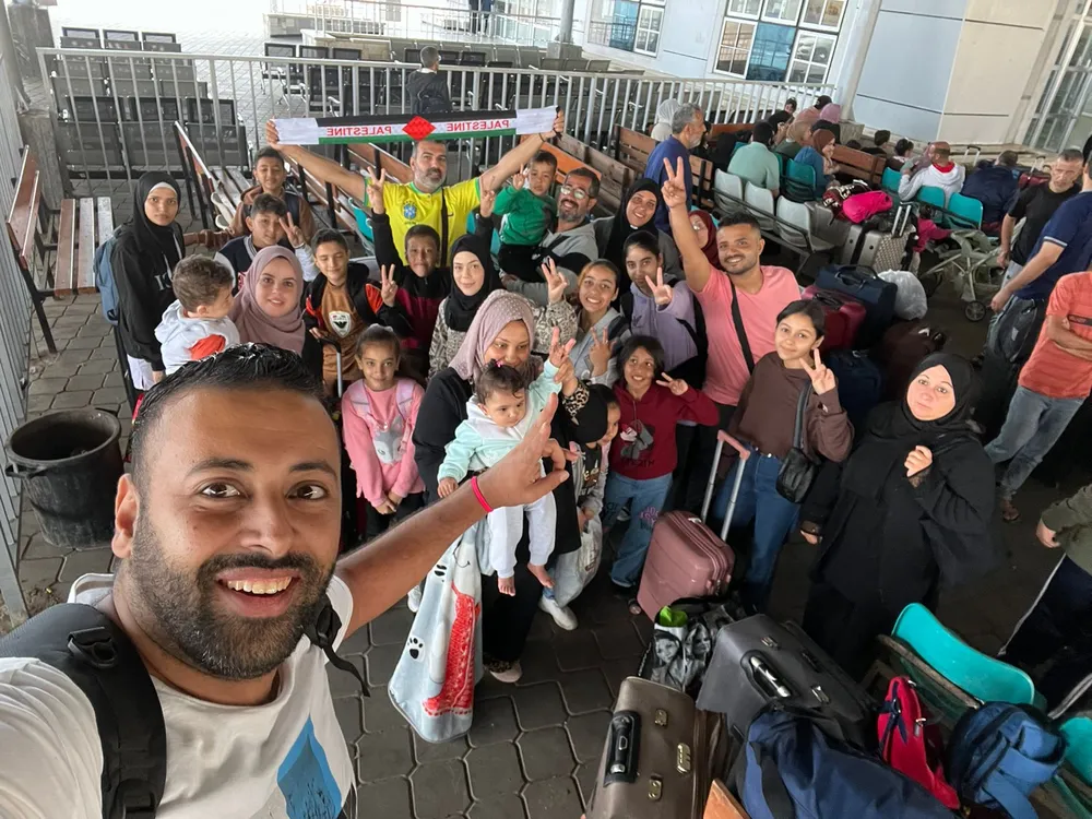 Hassan Rabee fotografa o grupo de brasileiros que tenta deixar Gaza neste domingo (12)