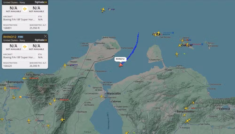 Os jatos voaram por mais de 30 minutos, sendo amplamente monitorados pelo FlightRadar24 e outros sites de rastreamento aéreo, atraindo atenção internacional. Esse sobrevoo foi um dos mais acompanhados do dia, com a presença dos caças se aproximando da cidade de Macaraibo, na Venezuela, localizada a poucos quilômetros do Golfo.