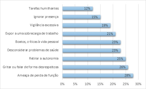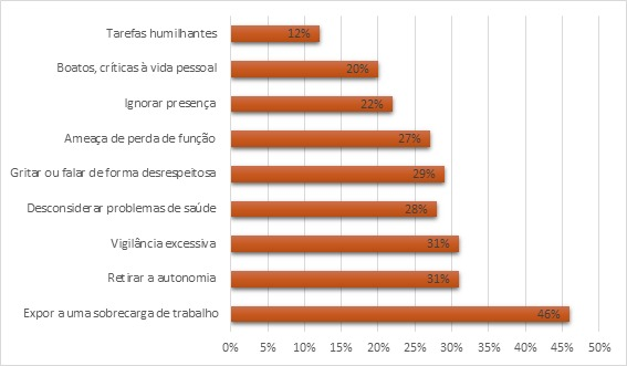 A partir dos resultados, identifica-se que a sobrecarga de trabalho é o assédio mais prevalente, seguido pela retirada de autonomia.