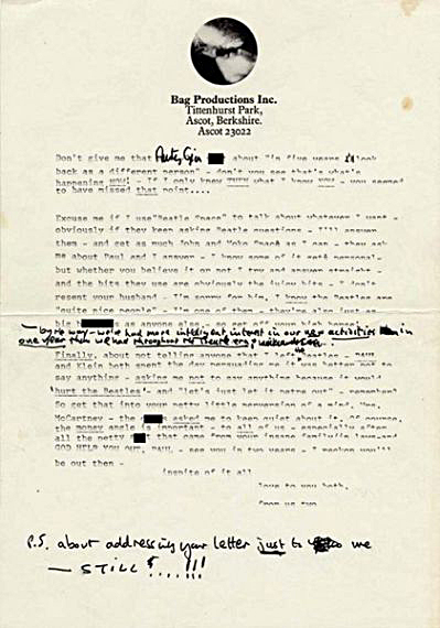 As porradas nos ex-Beatles e no produtor George Martin são antológicas. Em 1971, aparentemente ofendido por uma carta anterior, ele desce a lenha em Paul, Linda e na reputação de sua antiga banda: “Quem vocês/nós somos? Eu espero que percebam a merda que vocês e o resto dos meus amigos bondosos e desinteressados jogaram em Yoko e eu desde que ficamos juntos. Linda, se você não se importa com o que eu digo, cale a boca! Deixe o Paul escrever ou qualquer coisa do tipo”.