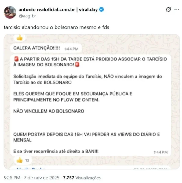 Trocas de mensagens acompanhadas pela revista Fórum mostram orientações atribuídas à equipe do governador para que os participantes não vinculem sua imagem à de Jair Bolsonaro. Uma das instruções, enviada na sexta-feira às 13h44, diz que a associação ao ex-presidente estaria proibida a partir das 15h. O aviso também exigia foco em trechos recentes do Flow Podcast, que recebeu Tarcísio e Derrite.