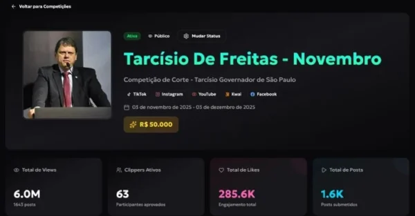 Aliados de Tarcísio Gomes de Freitas (Republicanos), governador de São Paulo, estão promovendo nas redes sociais, entre 3 de novembro e 3 de dezembro, um campeonato de cortes com prêmio de R$ 50 mil para quem entregar maior engajamento ao editar vídeos de entrevistas do governador e de Guilherme Derrite.