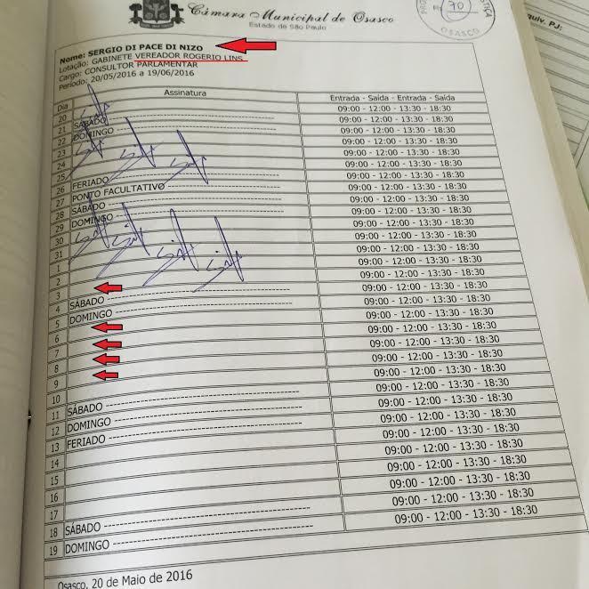 O funcionário Sergio Di Pace Di Nizio, líder do PRP e aliado de Lins, não estava com todas as presenças registradas. E sua esposa, que também faz parte dos quadros de funcionários do gabinete candidato em Osasco, Patricia Cabrera Pereira Di Nizio, também estava com a folha de ponto apresentando ausências em dias úteis.