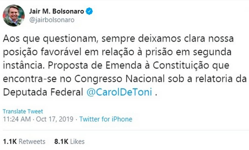 Ele pediu desculpas em sua conta no Twitter por uma publicação de Jair defendendo a execução de pena após condenação em segunda instância.