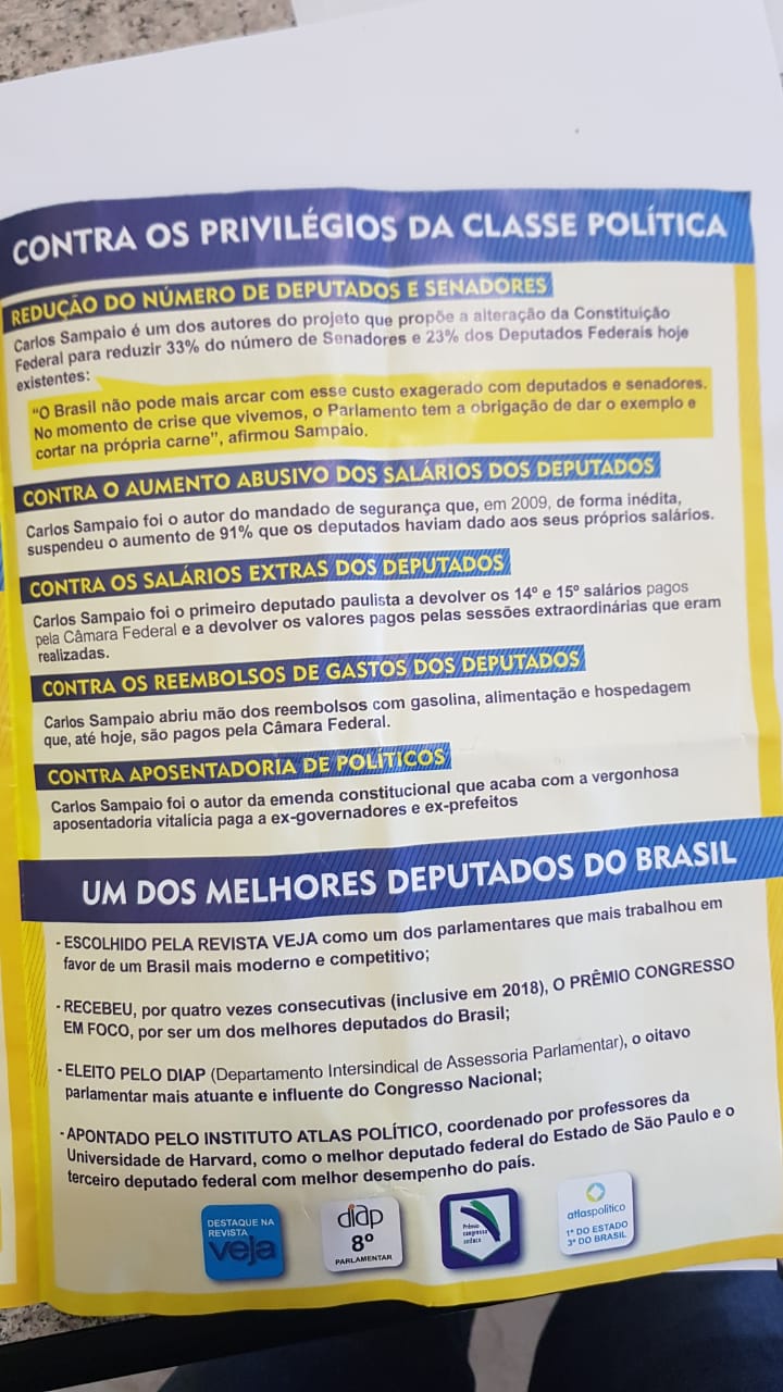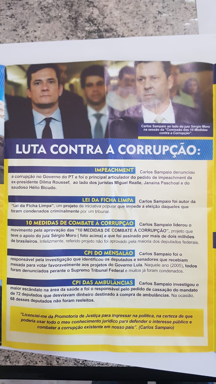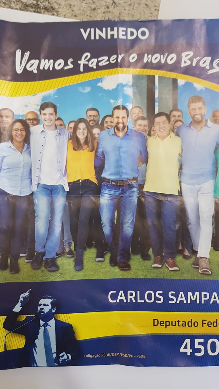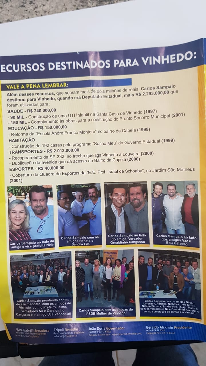 Em material de Carlos Sampaio distribuído em Vinhedo, interior de São Paulo, Alckmin evaporou e Jair Bolsonaro aparece em foto.