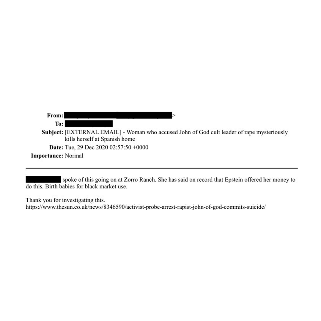 Entre os documentos, um e-mail de dezembro de 2020 em que um autor desconhecido (nome censurado) cita nominalmente a ativista brasileira Sabrina Bittencourt e suas denúncias contra João de Deus — especificamente sobre “fazendas de bebês” em Goiás: “Centenas de meninas foram escravizadas ao longo de anos, viveram em fazendas em Goiás e serviram como úteros para engravidar e ter seus bebês vendidos.”