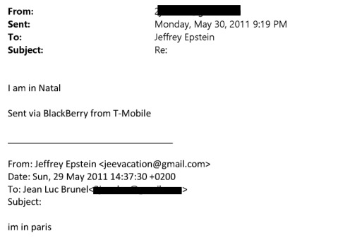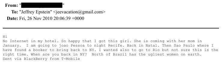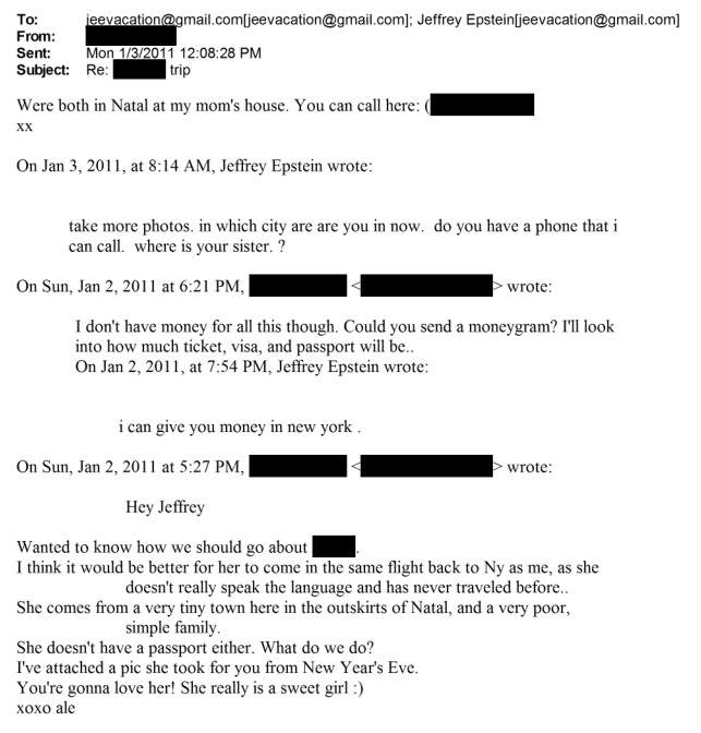 Em um e-mail datado de 26 de novembro de 2010, uma pessoa com o nome sob tarja informa a Epstein que “estava feliz de conseguir essa garota”, afirmando que ela viajaria a Nova York em janeiro do ano seguinte acompanhada da mãe. Na mesma mensagem, o interlocutor diz que a jovem passaria por Recife e São Paulo e que havia interesse em ir ao Rio de Janeiro.