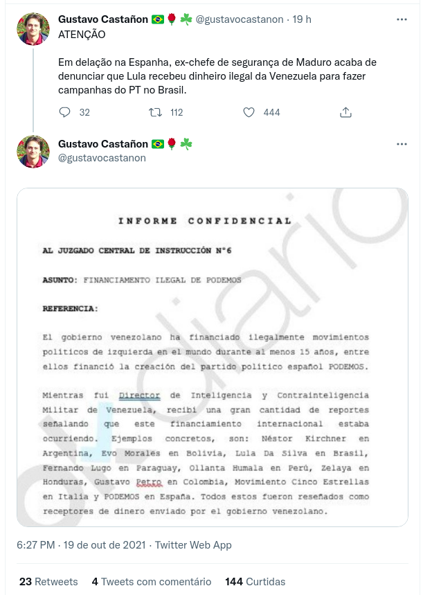 Eu quero falar de uma postagem incrivelmente baixa que ele fez ontem, usando uma nova armação da extrema direita internacional, com possível influência do submundo reacionário dos serviços de inteligência dos Estados Unidos, contra o Podemos, um dos mais importantes partidos de esquerda da Espanha.