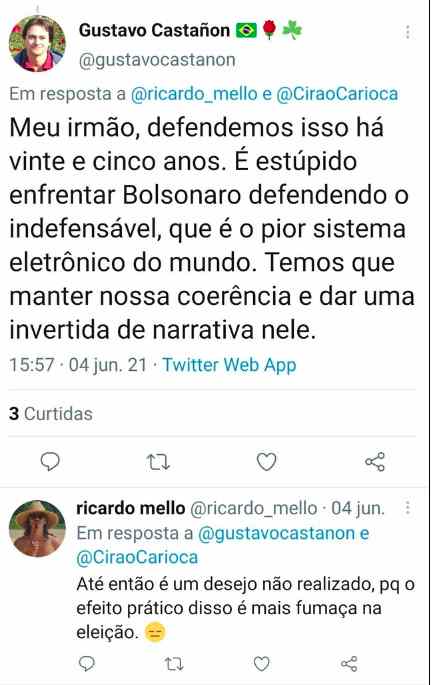 Parte da militância cirista seguiu a diretriz do Carluxo rosinha e também passou a questionar a confiabilidade das urnas. No último momento, porém, o PDT entendeu que as intenções do bolsonarismo não eram sérias e orientou voto contra o voto impresso. O deputado Pompeu de Mattos, todavia, que havia passado os meses anteriores compartilhando postagens de Castañon, não seguiu a orientação partidária e votou a favor da pauta bolsonarista.