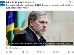 STF no alvo: depois de Moraes com o Master, Folha tenta ligar Toffoli...